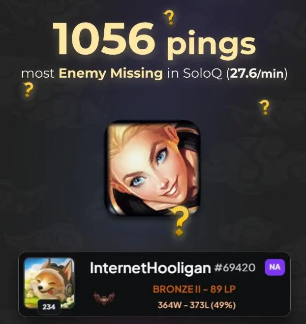 《英雄联盟》内置了信号系统,其中使用频率最高的信号,无疑是用于提醒队友“敌人消失”的问号标记。当然,问号标记也早已被玩家们“玩坏了”。数据显示,北美服务器有一位拉克丝玩家在单局游戏中标记了1056次“敌人消失”,平均每分钟超过27次,成为2025年标记问号最多的《英雄联盟》玩家。估计他那局的鼠标都要被点坏了,队友恐怕早已将他屏蔽。