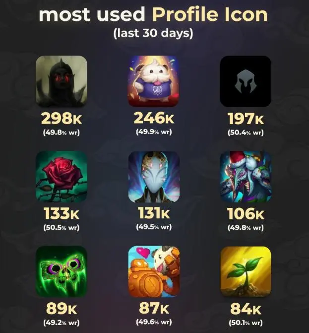 最后是过去30天内最常使用的玩家头像榜单:诺克萨斯赛季活动赠送的“黑玫瑰 乐芙兰”头像排名第一,全球总决赛预测活动赠送的魄罗头像位列第二。Faker偏爱的“红玫瑰”头像排在第四,双城之战主题的两款头像分列第五和第七,近期冰雪节活动赠送的“圣诞男爵”头像则排名第六。总体而言,这些年度盘点内容颇为有趣,让我们看到了峡谷的多样风貌,也期待新一年的《英雄联盟》能带来更多精彩。
