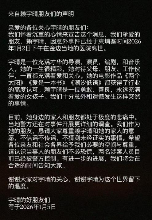 23 岁的女导演编剧赖宇晴在柬埔寨的金边坠楼身亡。