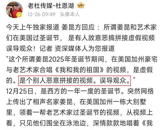 当时一段姜昆在庭院里拉手风琴、和人合唱《我和我的祖国》的视频被疯传,发布者特意标注“加州豪宅”“圣诞狂欢”,瞬间引爆舆论。
