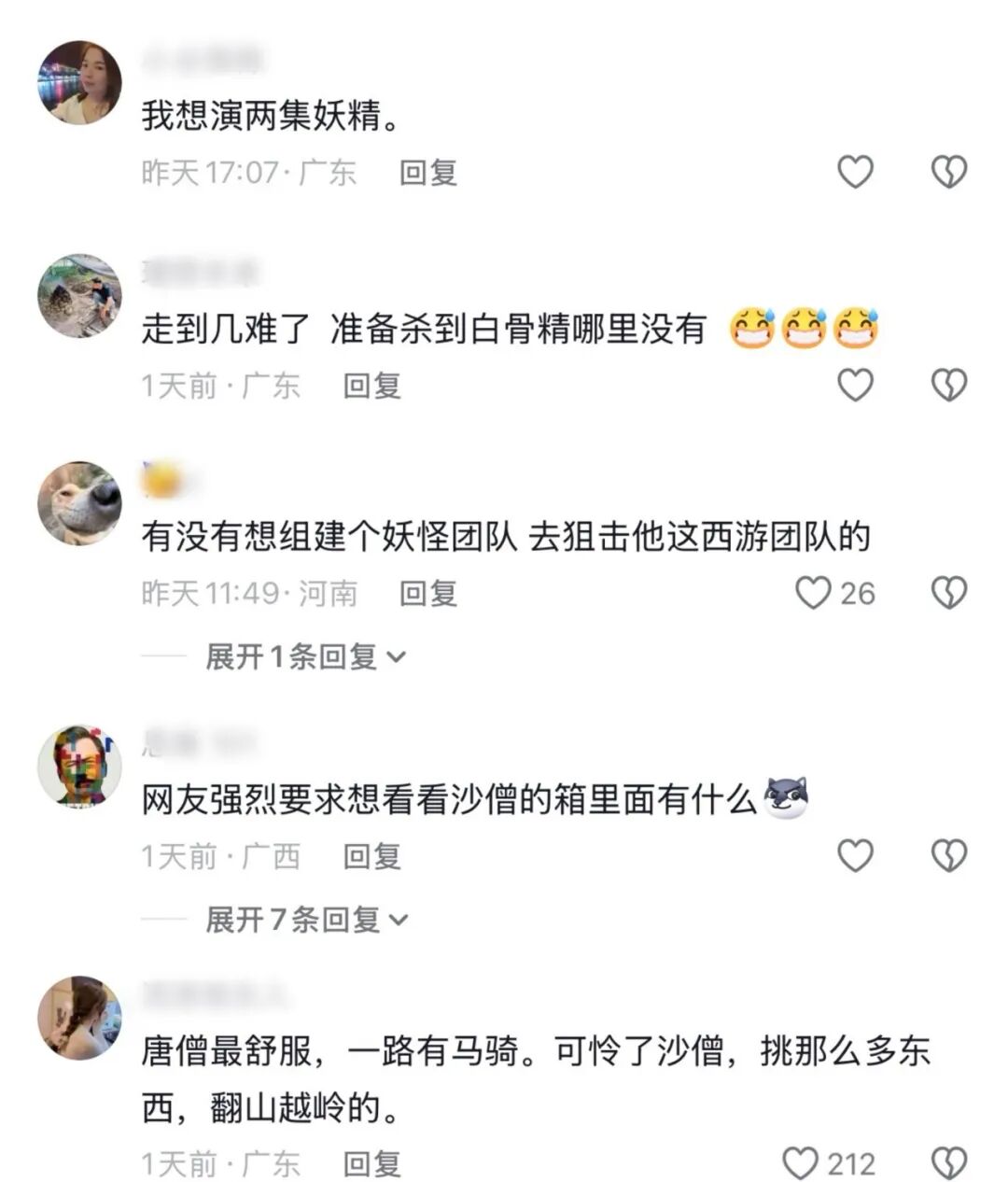 有网友说,我想演两集妖怪;还有更绝的留言,要组个妖怪团队去狙击他们;也有网友好奇沙僧的箱子里都装了什么。
