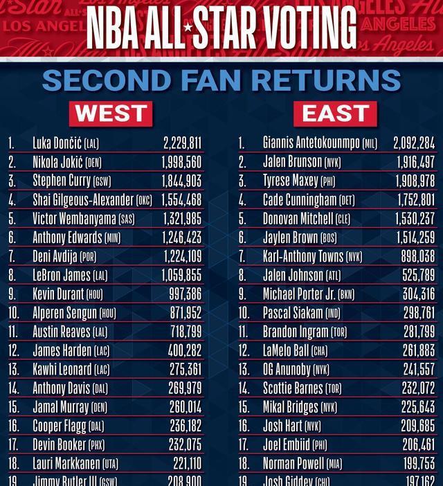相较于首轮得票情况,次轮东西部首发依然与首轮保持不变!西部依然是东契奇、约基奇、库里、亚历山大、文班亚马领衔首发;而东部同样是字母、布伦森、马克西、坎宁安、米切尔领衔,虽然没人票数都有上涨,但排名依然不变!值得注意的是,东西部首发排名虽然没有变化,但仍然存在变数!西部第五的文班亚马仅仅领先第六的爱德华兹从首轮的11万票,缩小到次轮的8万票,在下一轮有可能被反超!而东部这边情况类似,第五名米切尔领先布朗仅仅2万票,随时都有可能被反超!尤其是近期绿军状态火热已经反超纽约高居东部第二,布朗的投票必然还会继续上涨!