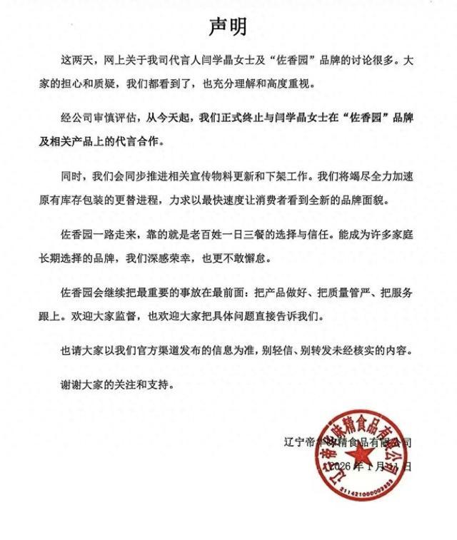 经公司审慎评估,从今天起,公司正式终止与闫学晶女士在“佐香园”品牌及相关产品上的代言合作。同时,会同步推进相关宣传物料更新和下架工作。我们将竭尽全力加速原有库存包装的更替进程,力求以最快速度让消费者看到全新的品牌面貌。