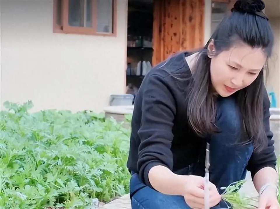 她蹲在四块菜畦间,手指捏着刚摘的带刺黄瓜,灰色毛衣沾着泥点,身后绿油油的西红柿和油麦菜长势正盛。 这片菜地,五年前还是私人游泳池。 2026年1月,45岁的童蕾在社交平台晒出这张照片时,网友几乎认不出这就是《亮剑》里清丽脱俗的“田雨”。 从身家百亿的豪门太太到亲手种菜的农妇,她只用了十年。