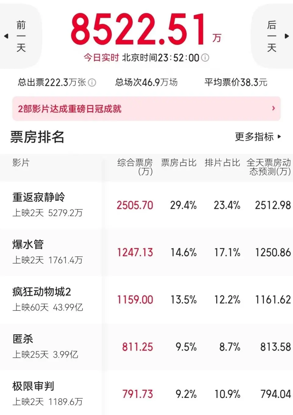 《重返寂静岭》蝉联夺冠,开画次日再次报收2492万,内地总票房已达5266万,全国影城经理给此片排了11万场,排片占比23.4%,可上座率仅4%。