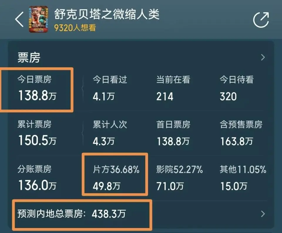《舒克贝塔之微缩人类》首映仅150万,数据方面也不怎么好,全国影城给此片排了1.4万场,排片占比3%,上座率仅2%。