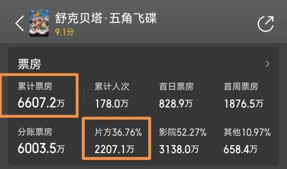 第一部为2023年公映的《舒克贝塔·五角飞碟》,影片的制作成本900万,加上宣发支出接近2000万,最终该片的全国总票房拿到6607万,除去成本,加上流媒体线上收入,最终实现了小赚。