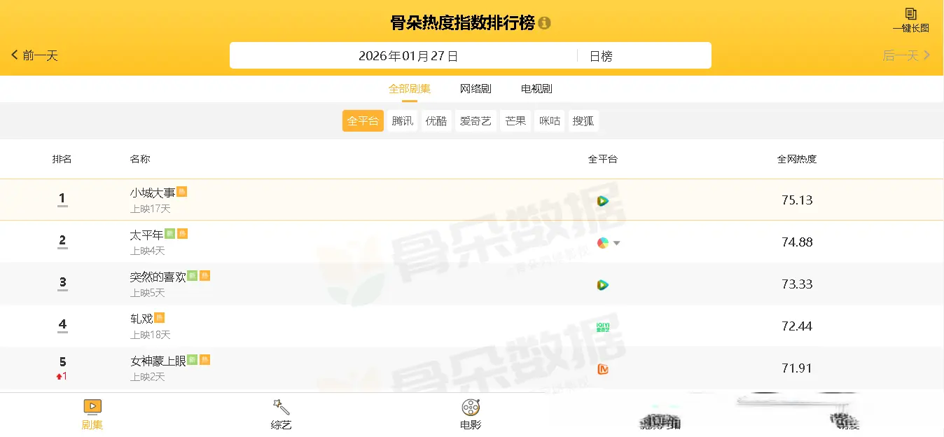 截止发文时间,从“骨朵热度指数排行榜”数据显示可知,当前热播电视剧中,全网热度最高的五部剧分别如下: