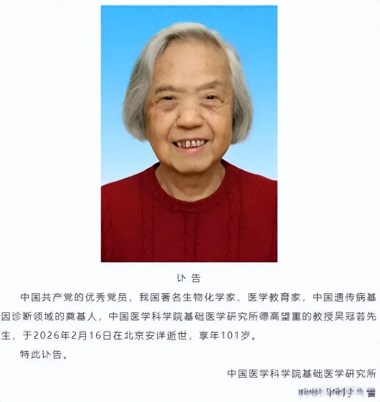 2月16日,除夕夜,万家灯火通明,中国著名生物化学家吴冠芸教授在北京安详辞世,享年101岁。