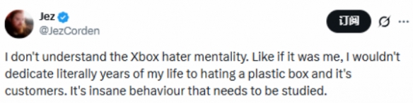 Windows Cen tral知名编辑Jez Corden近日激烈抨击社交媒体上的"Xbox仇恨文化",直言完全无法理解"黑粉将数年时间用于抨击游戏主机及用户"的行为,认为"这种疯狂需被研究"。
