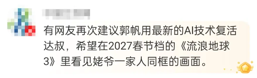 也有网友表示,《流浪地球3》依然用心纪念达叔,让“姥爷”这个经典角色永远留在了流浪地球的故事里,纷纷直言:“就冲这份心意,上映必去影院支持。”