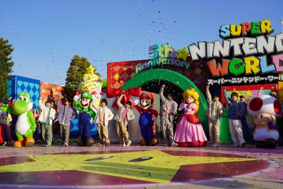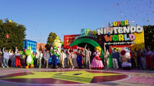 为庆祝开园五周年,园区推出了一系列特别活动。故事设定为马力欧、路易吉、桃花公主、奇诺比奥和耀西五人决定一起烤蛋糕。桃花公主想在蛋糕上添加特别装饰,便拜托奇诺比奥去取无敌星。不料,当奇诺比奥打开箱子的瞬间,无敌星四处飞散,被触碰到的物体纷纷闪耀五彩光芒,整个蘑菇王国充满了无敌星的庆祝能量。