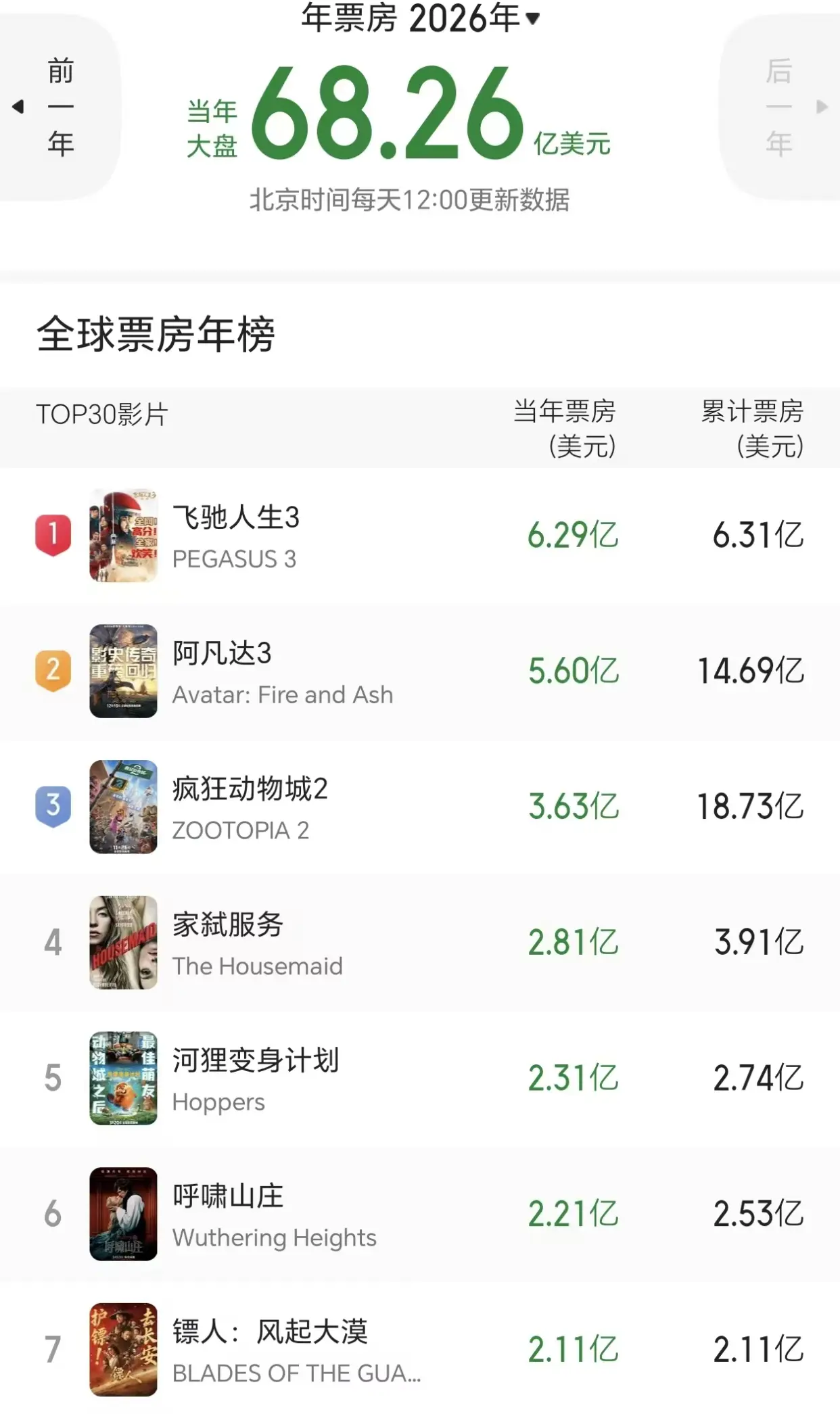 目前在全球年度票房榜中,由沈腾领衔主演的《飞驰人生3》,依然以6.31亿美元的成绩稳居冠军的位置。
