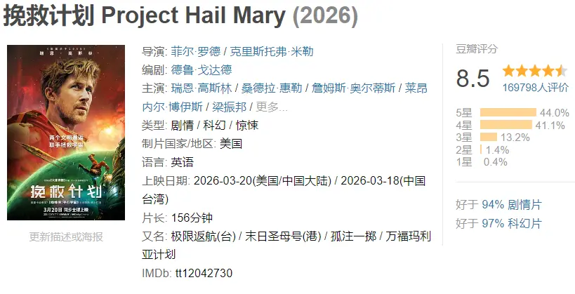 在北美,《挽救计划》的IMDb评分高达8.5分,在中国内地,同样也有近17万人为其打出了8.5的分数。