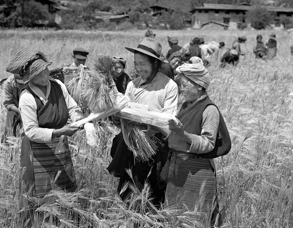 1960年,西藏亚东县仁青岗乡的农民喜迎民主改革后第一个丰收。 陈珺摄(