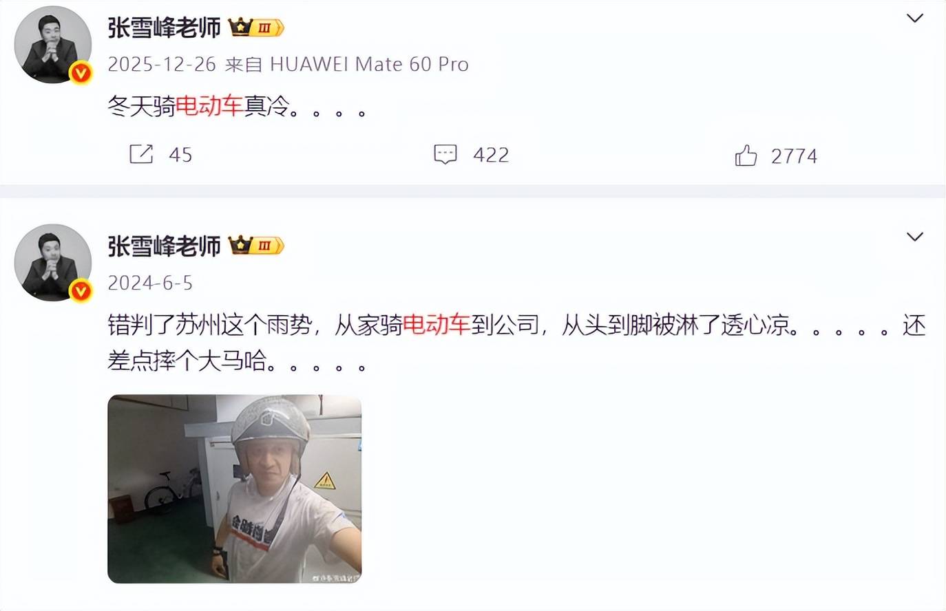 值得一提的是,张雪峰的这辆电动车骑了好多年,从他分享的动态得知,即便天气严寒、刮风下雨,他都会骑电动车上班。