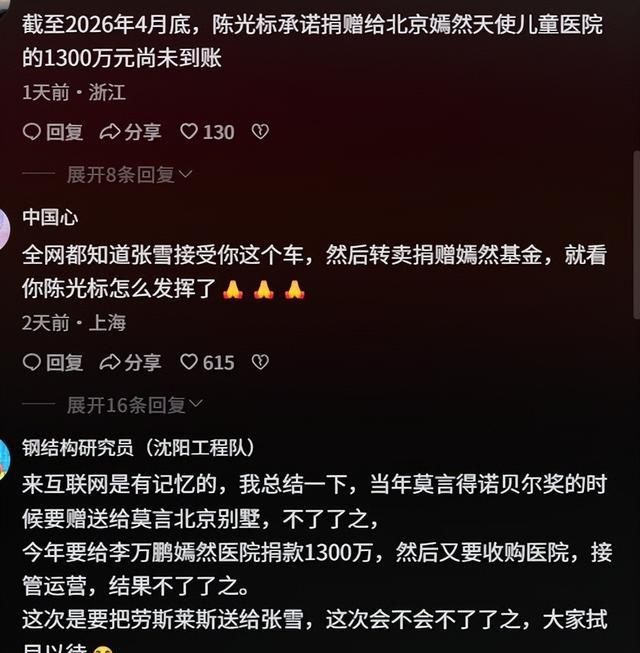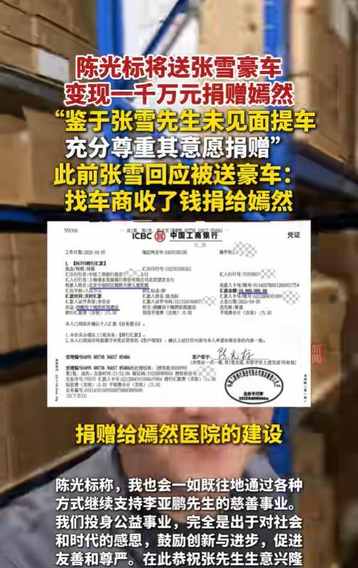 陈光标此前承诺赠予张雪的价值 1300 万劳斯莱斯,因对方未在规定时间内提车,最终陈光标按照张雪此前的意愿,将车辆变现后全额捐赠给嫣然天使儿童医院,用于医院建设发展。