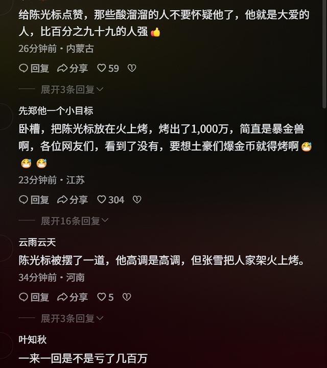 更有网友在线喊话李亚鹏,希望其出面回应善款是否到账,也有人调侃是张雪的态度 “刺激” 到了陈光标,才促成了此次捐赠。甚至有网友算起了细账,对捐赠金额提出疑问,还有人戏称陈光标是被舆论架在火上烤,不得不兑现承诺。