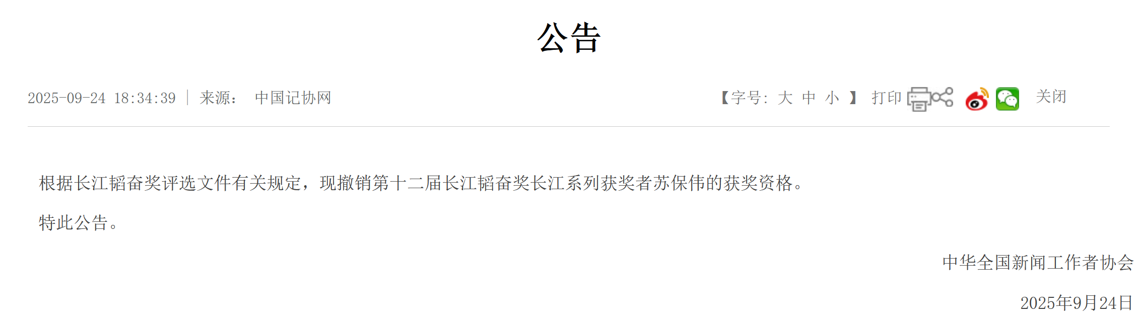 中国记协:撤销苏保伟获奖资格