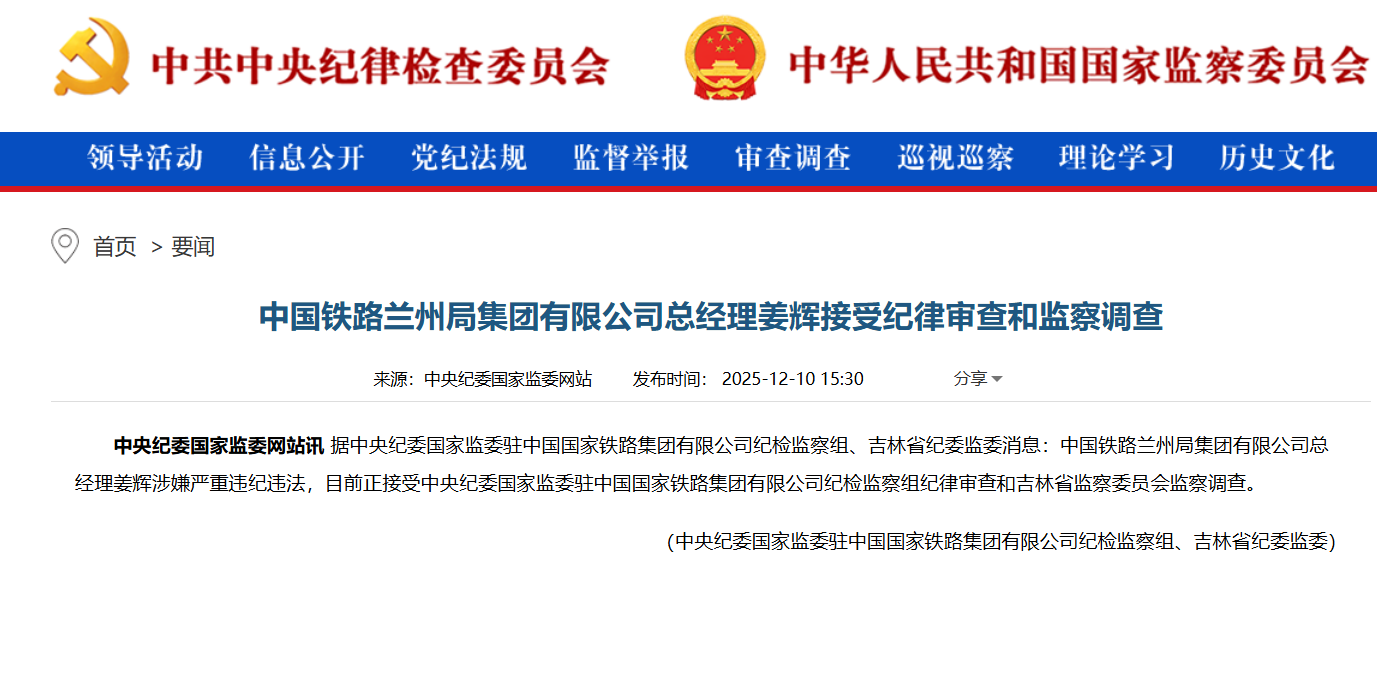 站内搜索:中国铁路兰州局集团总经理姜辉被查