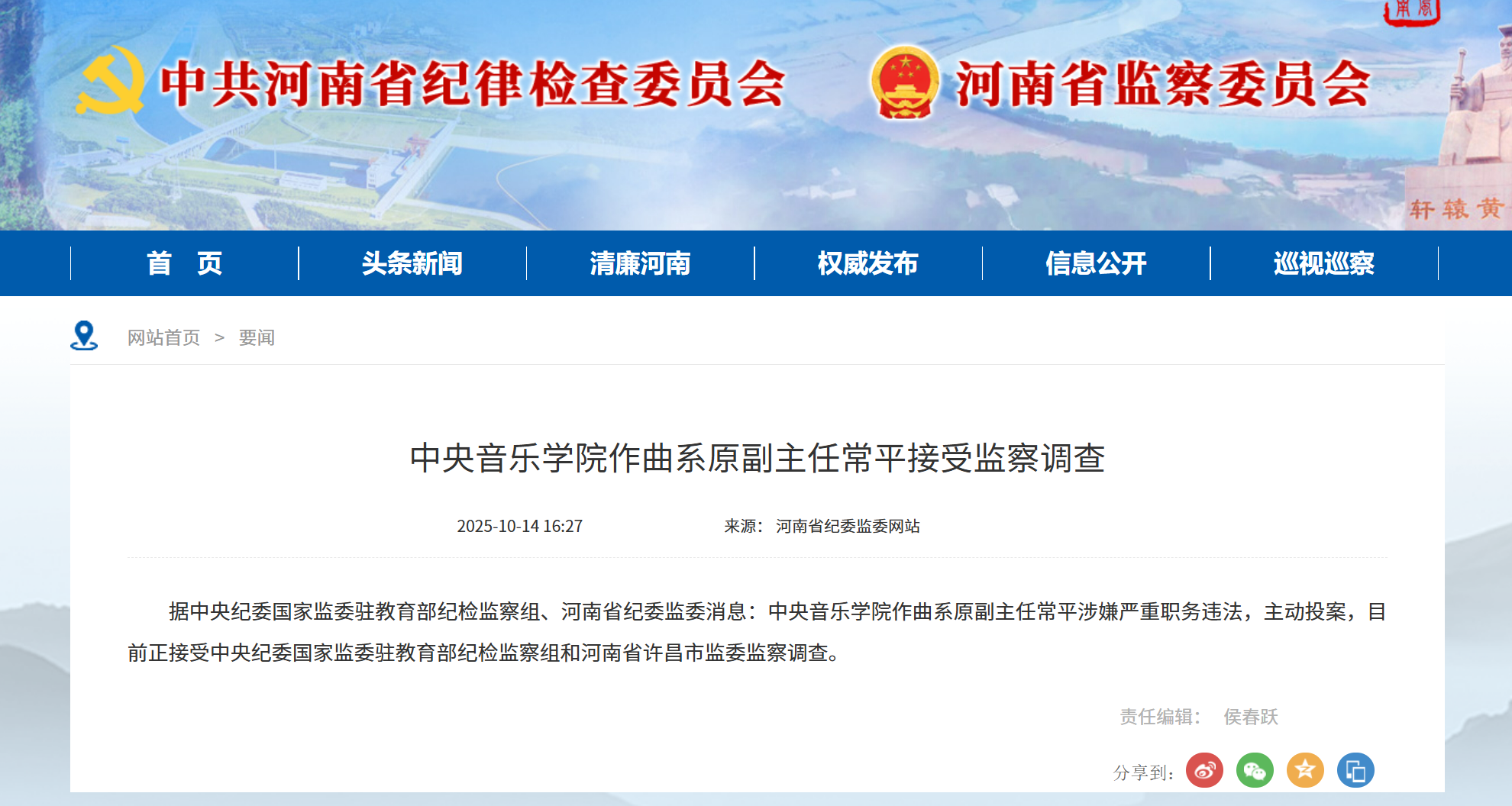 站内搜索:中央音乐学院作曲系原副主任常平,主动投案