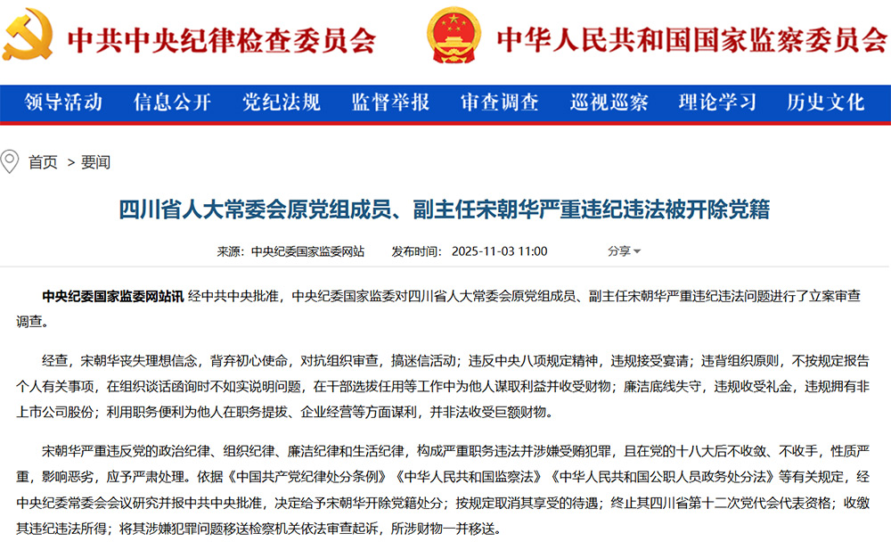 站内搜索:四川省人大常委会原副主任宋朝华被开除党籍
