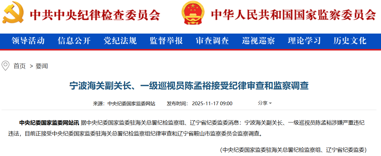 宁波海关副关长、一级巡视员陈孟裕被查