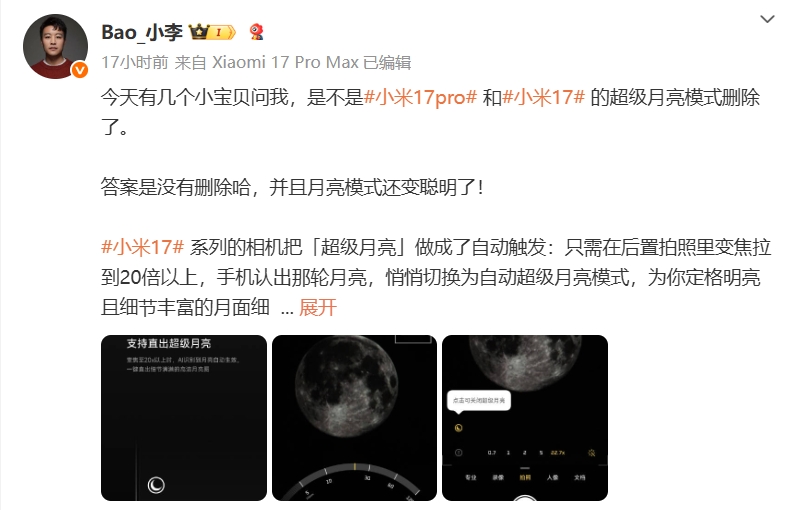 小米17系列“超级月亮”模式“变聪明了”,改为自动触发