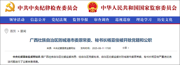 站内搜索:杨亚俊被“双开”:搞权色交易,毫无纪法底线