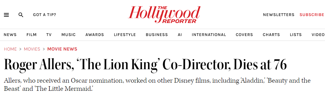 美国动画导演罗杰·艾勒斯去世,曾执导动画《狮子王》
