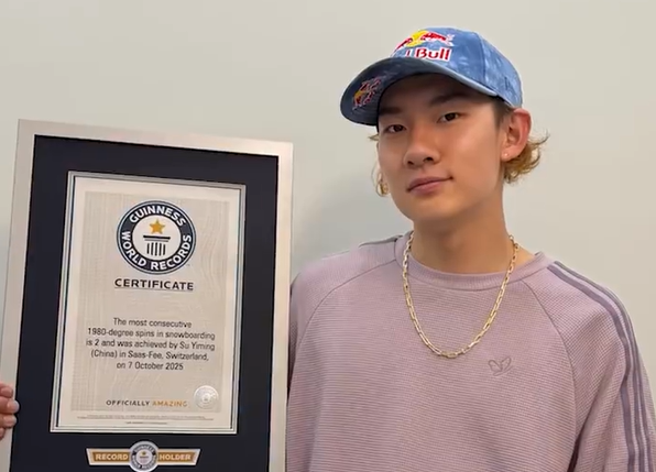 苏翊鸣完成的“背靠背1980”动作获吉尼斯世界纪录官方认证