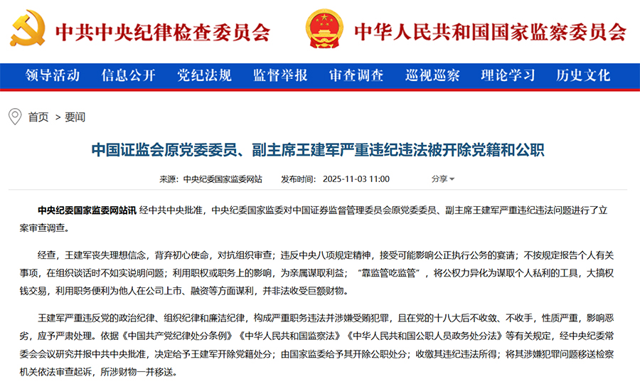 站内搜索:证监会原副主席王建军被“双开”