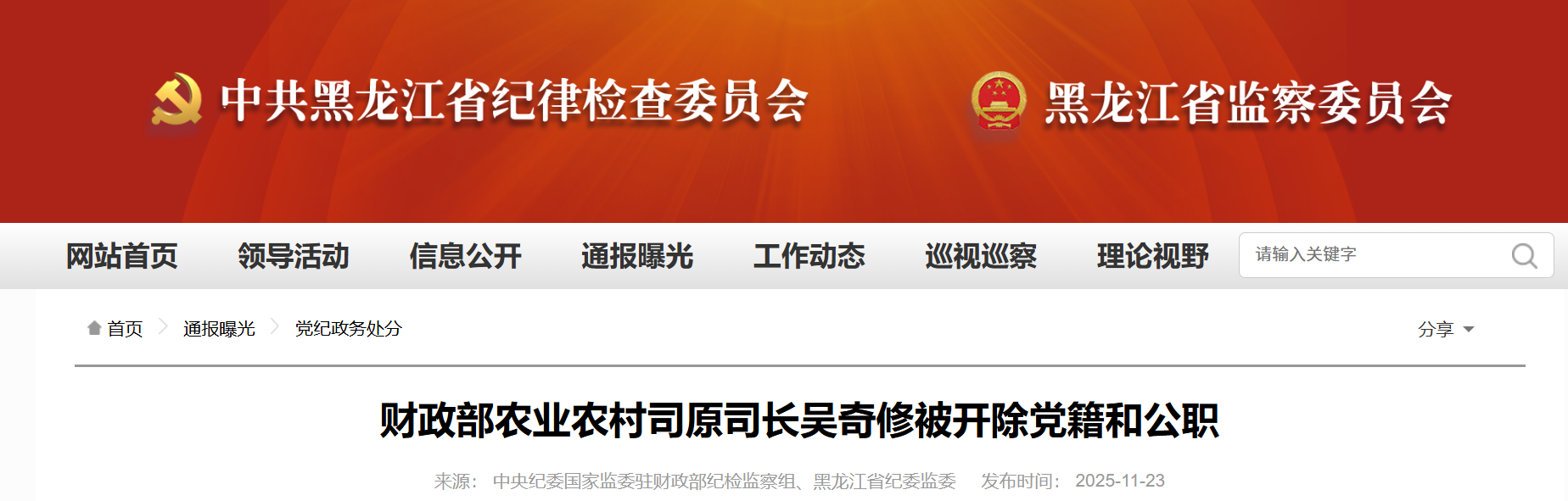 站内搜索:财政部农业农村司原司长吴奇修被双开