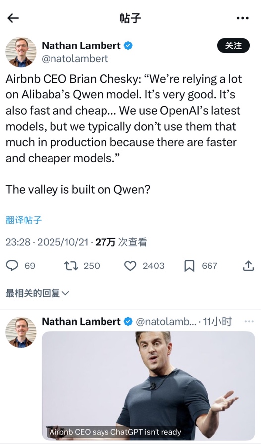 Airbnb CEO称大量依赖阿里通义千问:比OpenAI更好更便宜,硅谷都在用