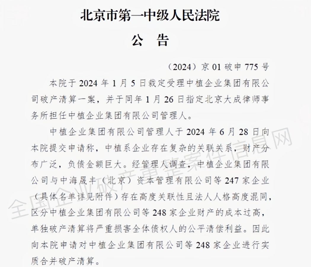 经管理人调查,中植集团与中海晟丰(北京)资本管理有限公司等247家企业存在高度关联性且法人人格高度混同,区分中植集团等248家企业财产的成本过高,单独破产清算将严重损害全体债权人的公平清偿利益。因此,管理人向北京一中院申请对中植集团等248家企业进行实质合并破产清算。
