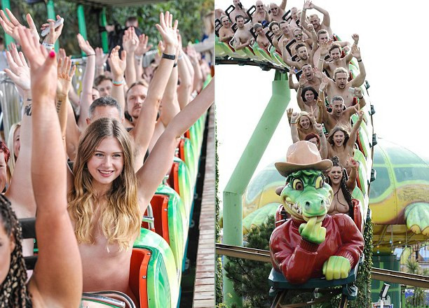 英国57名男女赤身裸体乘过山车筹治癌善款 场面震撼