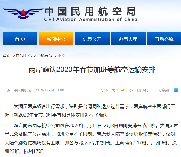 满足旅客出行需求,两岸确认2020年春节加航班