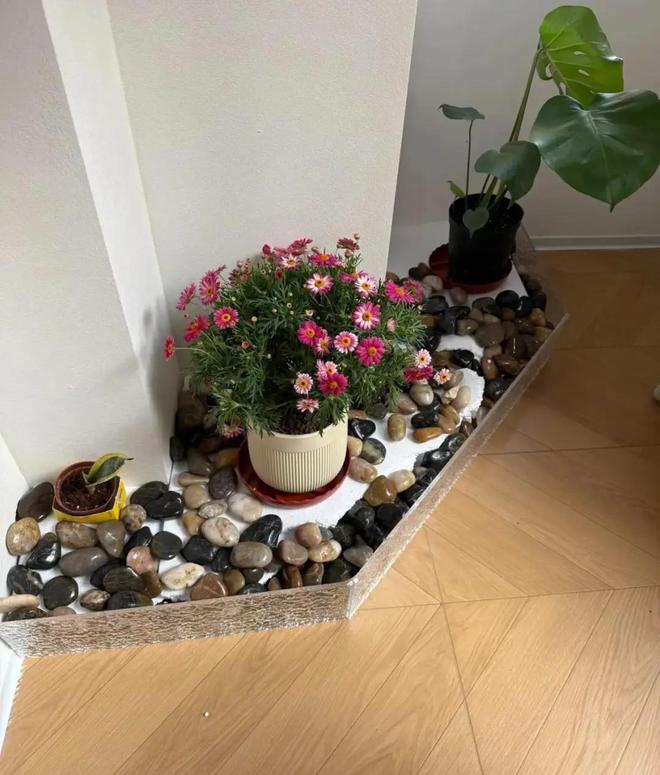 这时,用花池边框是用亚克力板粘接起来的,管道是用泡沫给盖住的。还可以在上面放了一些鹅卵石,两个盆栽,就变成小花池。
