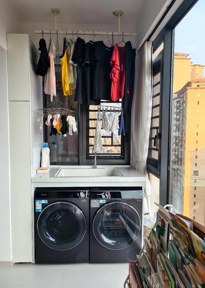 当然了,如果觉得在阳台下面放洗衣池,上面晾衣服会显乱的话,也有办法解决的。