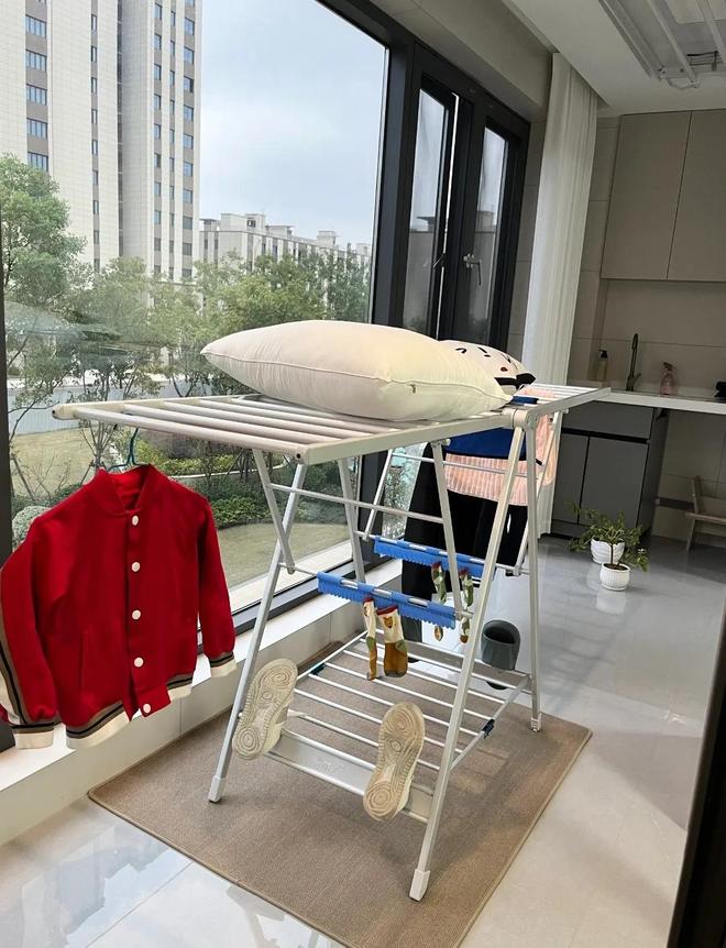 然后再搭配一个可移动折叠的晾衣架,遇到衣服多时将其拿出来。