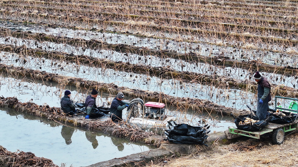 12月22日,在邢台经济开发区九家铺村莲藕种植基地,村民采挖莲藕,准备供应市场。