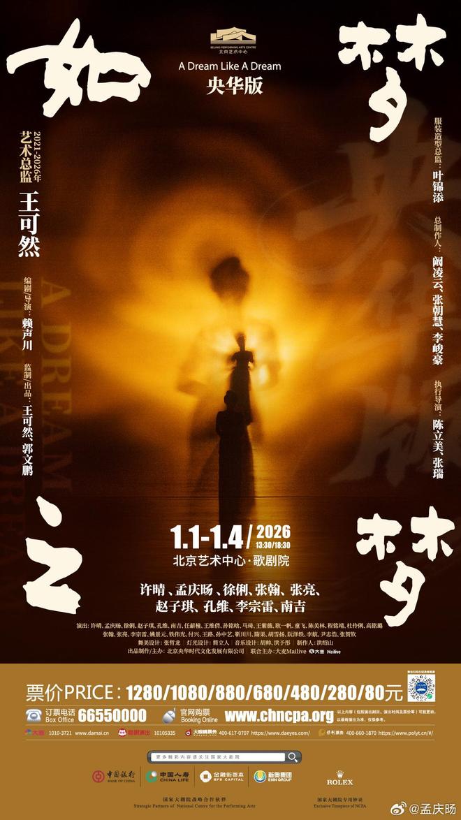 央华版《如梦之梦》北京站(2026年1月1日至4日)将由孟庆旸、许晴、徐俐分别出演青年、中年、老年顾香兰;而后续巡演中,孟庆旸将接替许晴出演中年顾香兰。这意味着观众将会在两个阶段看到她与角色关系的变化:北京站更像“首次入梦”的公开亮相——青年香兰的锋利、明亮与被命运推着向前的无畏,会首先显影;而当巡演推进,她转入中年香兰的段落,角色身上那些更复杂的沉淀:欲望的回声、代价的重量、记忆的反噬、命运的复写,都会要求她用更成熟、更具生活质感的方式完成戏剧表达。对一个从舞者出发的演员而言,这几乎是一场以角色为课程的“二次成长”。