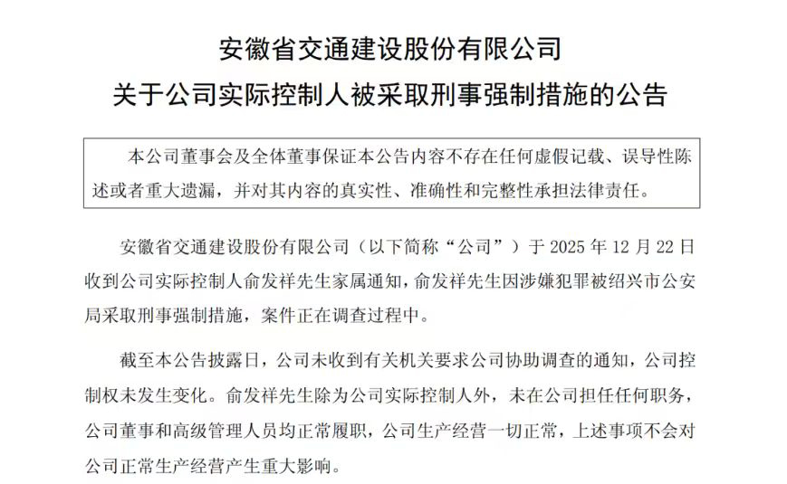 12月22日晚间,祥源文旅(600576.SH)、交建股份(603815.SH)、海昌海洋公园(02255.HK)三家上市公司同步发布重磅公告,披露公司实际控制人俞发祥因涉嫌犯罪,已被绍兴市公安局采取刑事强制措施,相关案件正在调查过程中。