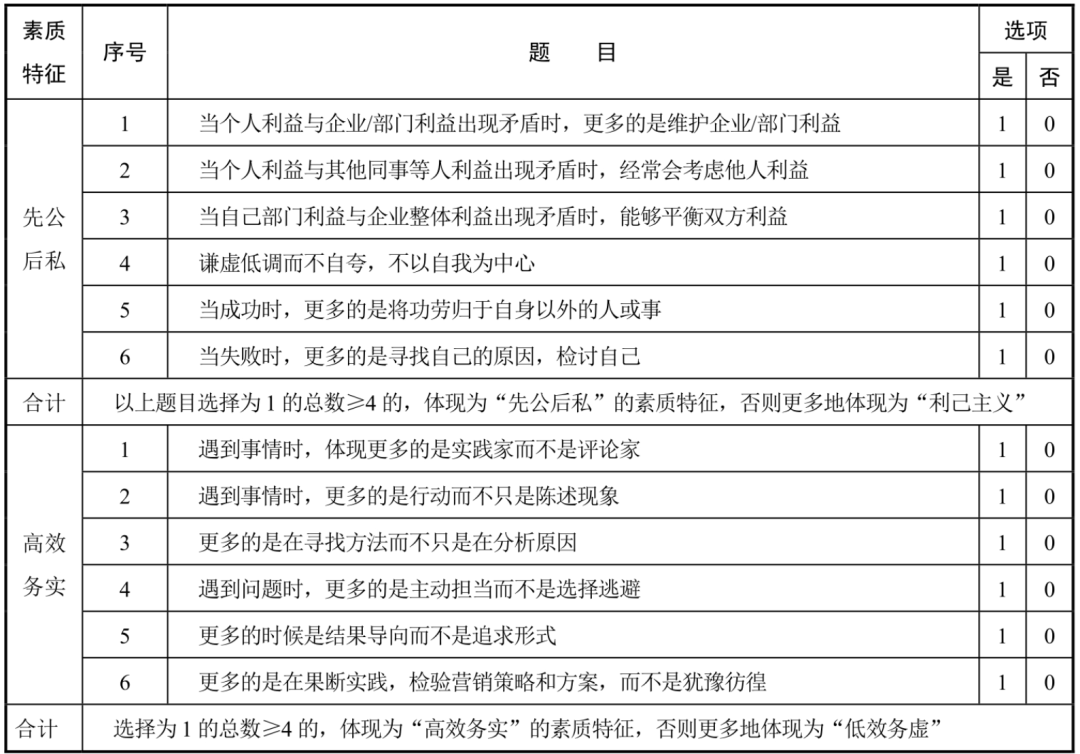 公实矩阵是以公私为纵轴、虚实为横轴,交叉形成4个象限,企业家们可以参考公实矩阵并利用表2来评价不同岗位人员的公私、虚实程度,将先公后私及高效务实两项素质评分结果定位到矩阵中的不同象限,以此将候选人区分为ABCD4类。