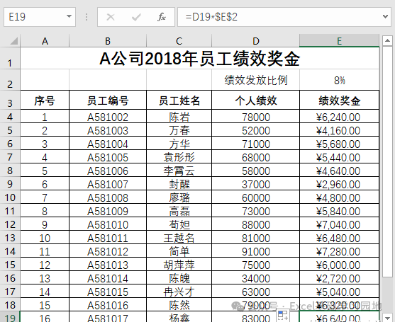 绝对引用绝对引用和相对引用相对应,是指引用单元格的实际地址,从属单元格与引用单元格之间的位置关系是绝对的。当复制公式到其他单元格时,Excel 会保持公式中所引用单元格的绝对位置不变,结果与包含公式的单元格位置无关。在相对引用的单元格的列标和行号前分别添加冻结符号【$】便可成为绝对引用。例如,公司的绩效发放比例一样,但个人绩效不一样,因此计算个人绩效奖金时,可以在E4 单元格中输入公式【=D4*$E$2】,如下图所示。