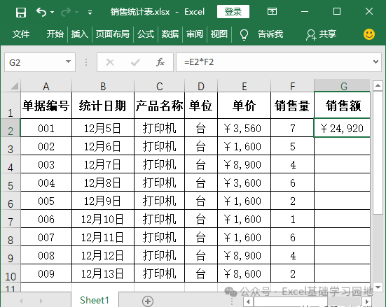 相对引用相对引用是指引用单元格的相对地址,即从属单元格与引用单元格之间的位置关系是相对的。默认情况下,新公式使用相对引用。使用A1 引用样式时,相对引用样式用数字 1、2、3……表示行号,用字母 A、B、C……表示列标,采用【列字母 + 行数字】的格式表示,如A1、E12 等。如果引用整行或整列,可省去列标或行号。例如,1:1表示第一行,A:A 表示A 列。采用相对引用后,当复制公式到其他单元格时,Excel 会保持从属单元格与引用单元格的相对位置不变,即引用的单元格位置会随着单元格复制后的位置发生改变。例如,在G2单元格中输入公式【=E2*F2】,如下图所示。