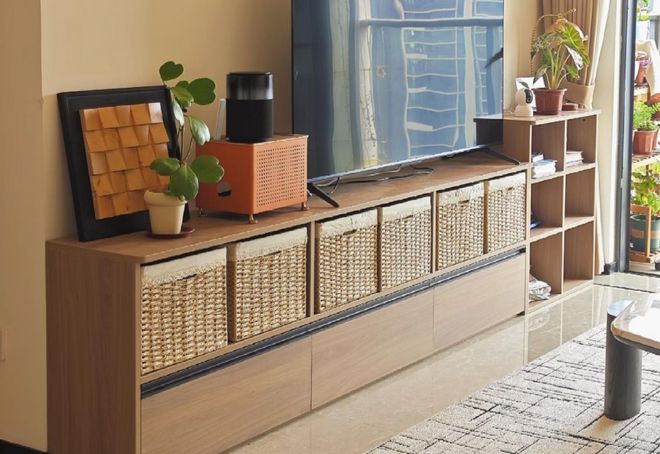 装修建议:地台的盖板需要安装隐藏式的拉手,或者是留指缝,边缘做防夹手的处理。内部建议使用统一规格的收纳箱,并于分类整理。