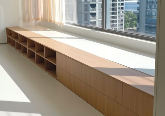 而盖板的表面可以与地板材质统一,或者是铺设软垫,作为坐垫来使用。
