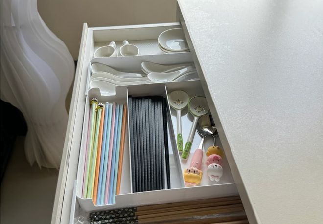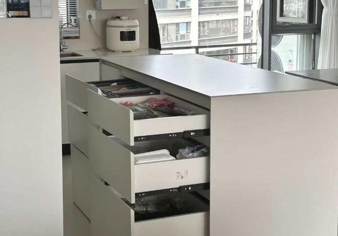在厨房岛台面向走道和烹饪区的两侧,分别设计不同深度和功能的抽屉。靠走道一侧设计为浅抽屉,放餐具,杯垫,零食;面向灶台一侧设计深抽屉,内置锅具拉篮,叠碗架。