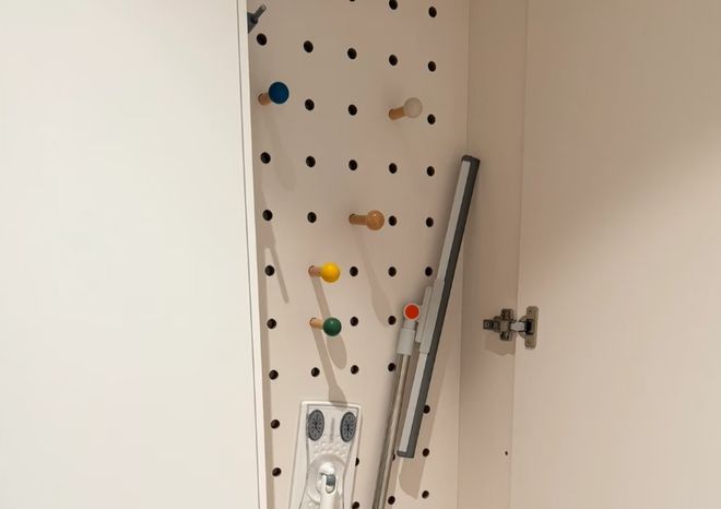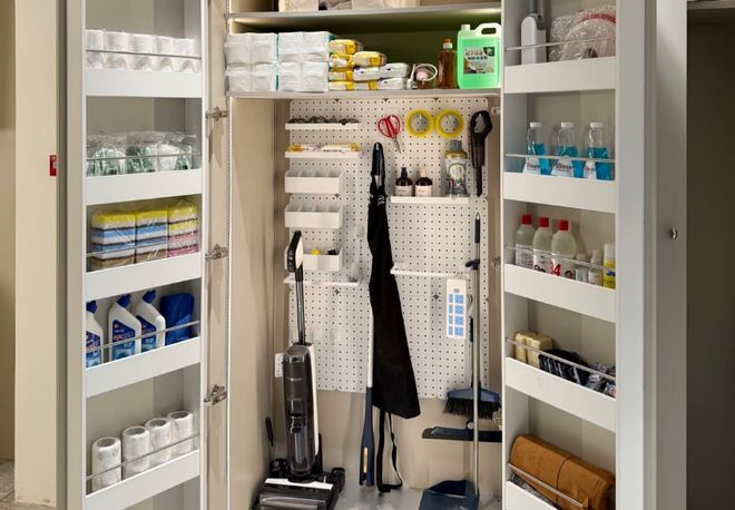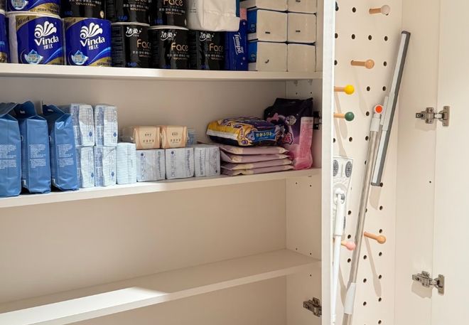家政柜内部是固定的储物格,用来存放清洁剂囤货;中间层是一个可以拉出来的折叠区;而外侧却是一个可以翻转的收纳区,将整个柜子利用到了极致。